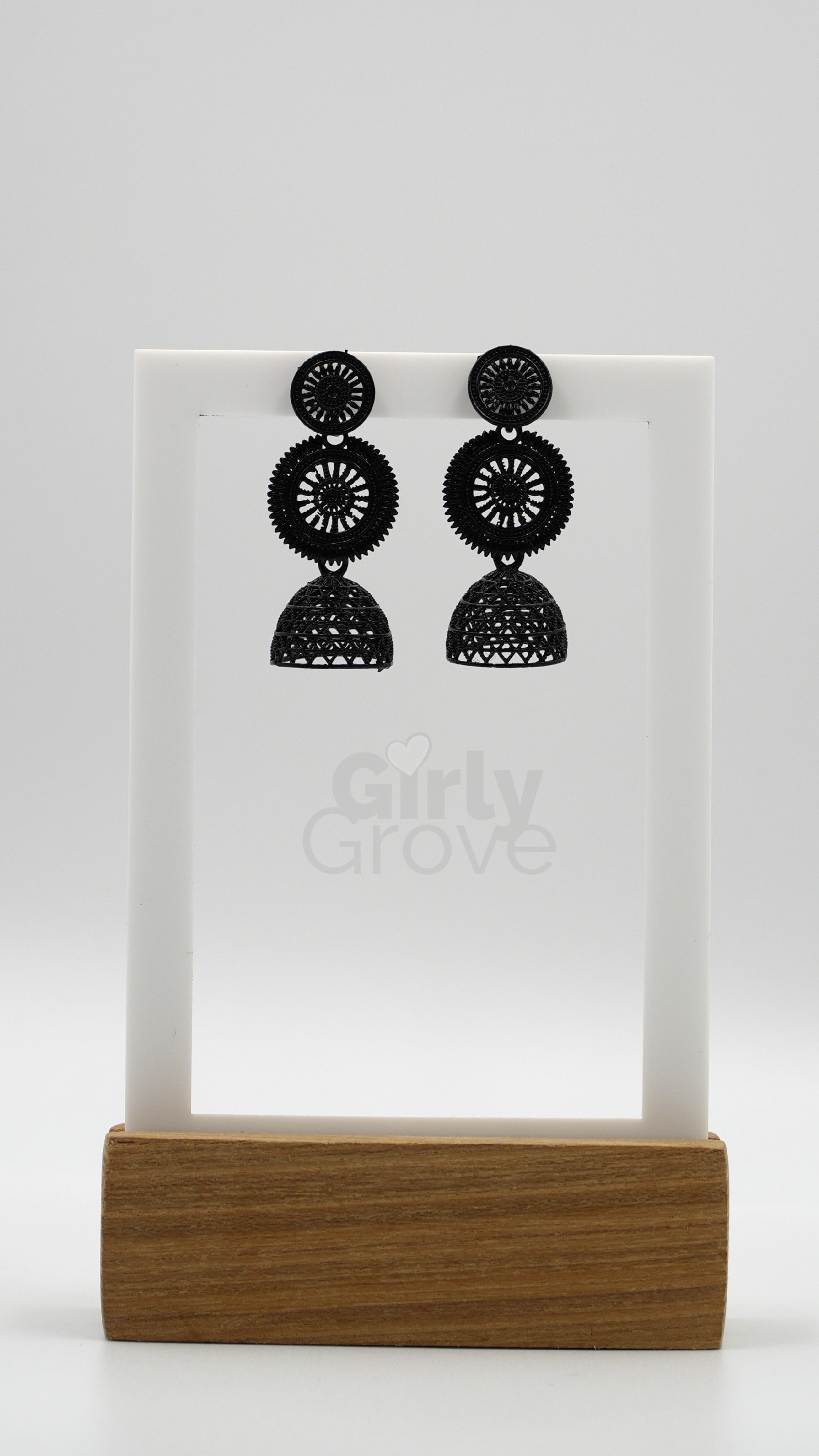 These exquisite black filigree dome earrings are perfect for adding a chic and contemporary touch to your wardrobe. Featuring an intricate circular design with lightweight jhumka-style domes, these earrings blend elegance with modern fashion. Ideal for both casual outings and festive occasions, they bring versatility and charm to your accessories collection.