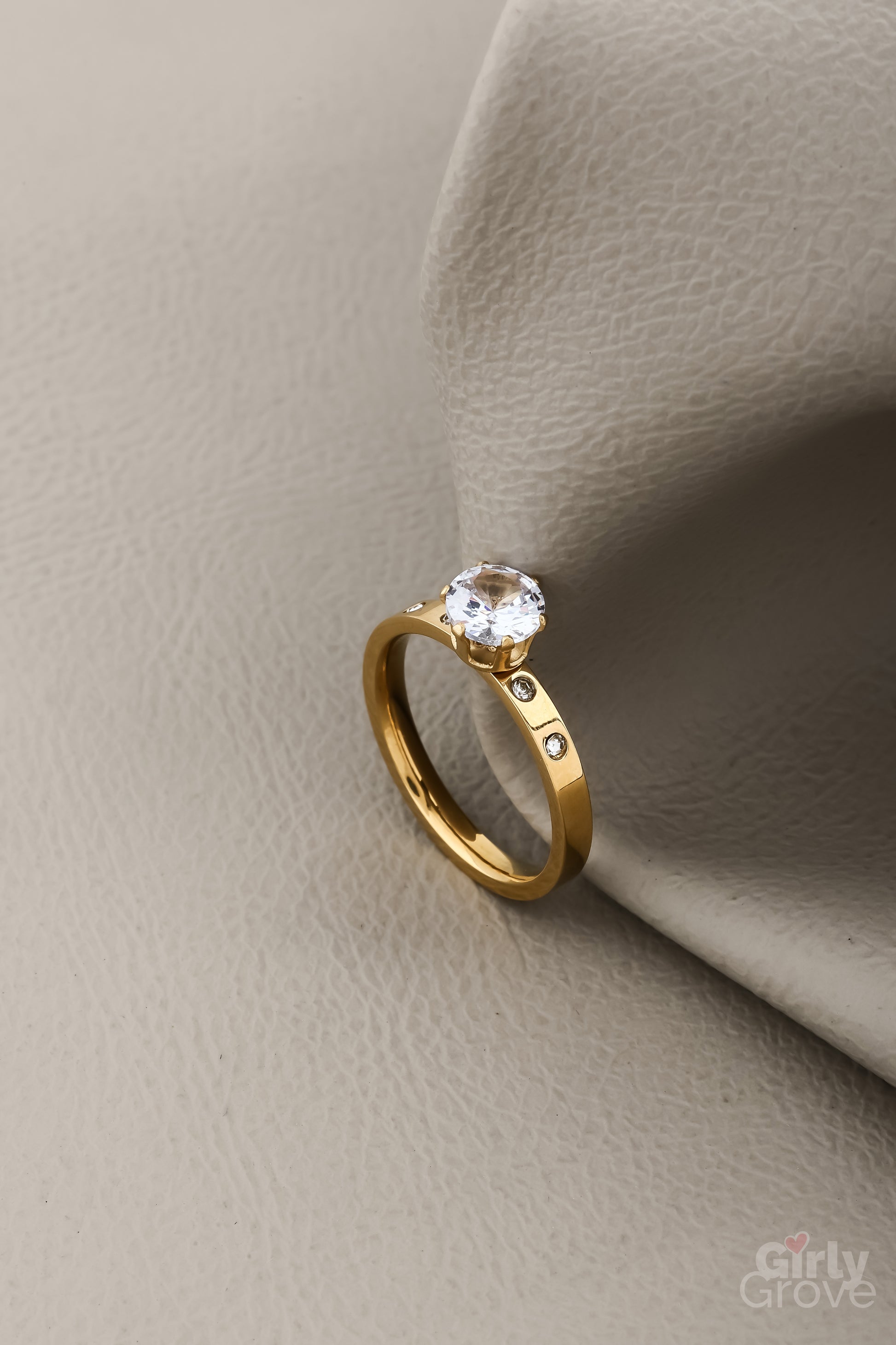 A timeless gold-plated ring featuring a dazzling solitaire stone with delicate side embellishments. Perfect for daily wear or special moments, this ring adds effortless elegance to your style.
