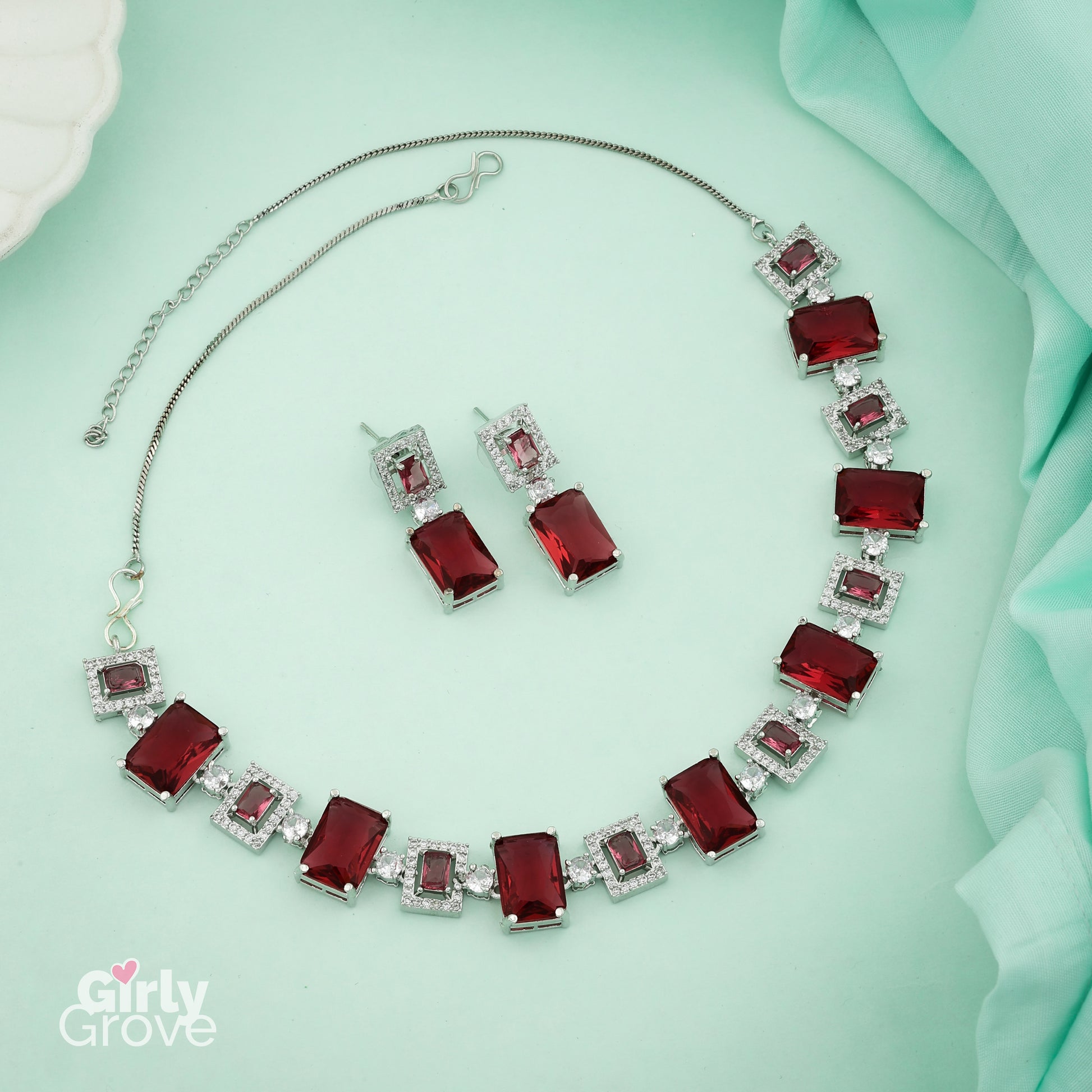 Add a splash of color and elegance with the Crimson Sparkle Necklace Set. Featuring rich crimson stones surrounded by brilliant diamonds, this necklace set exudes sophistication and timeless beauty, perfect for special occasions.