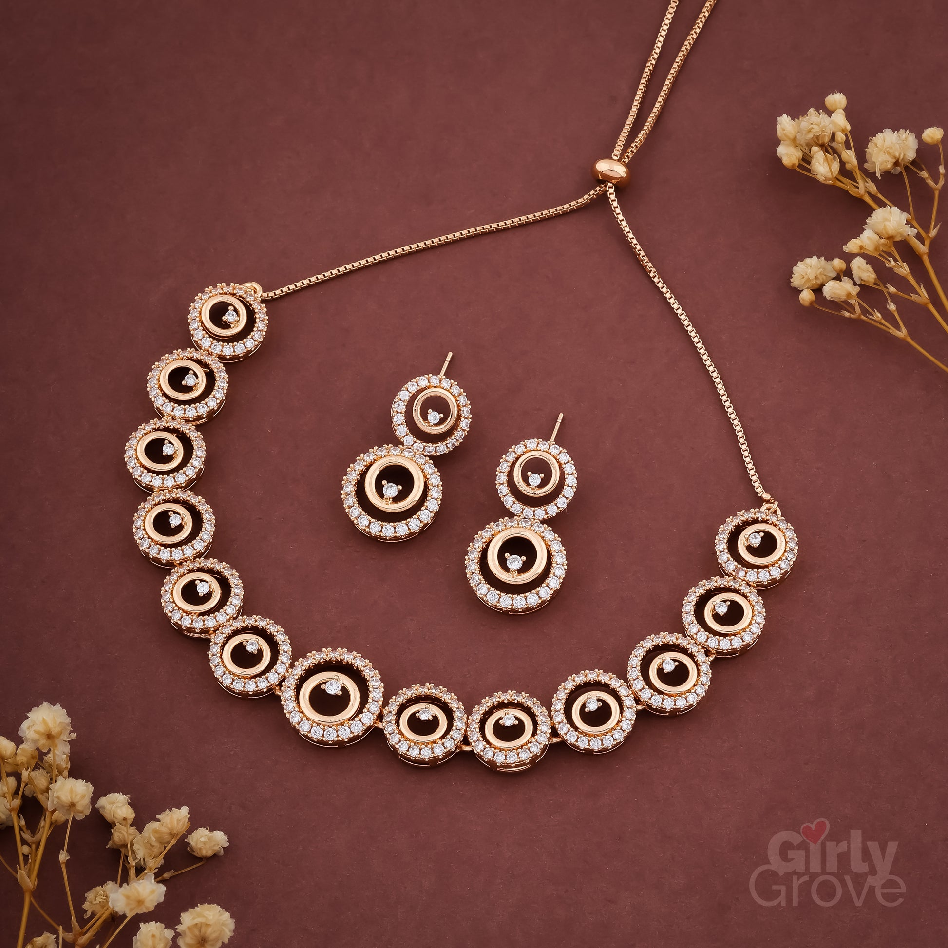 Designed with opulent circular elements and dazzling rhinestone accents, this necklace and earring set exudes sophistication, making it perfect for special occasions or adding glamour to your evening ensemble.