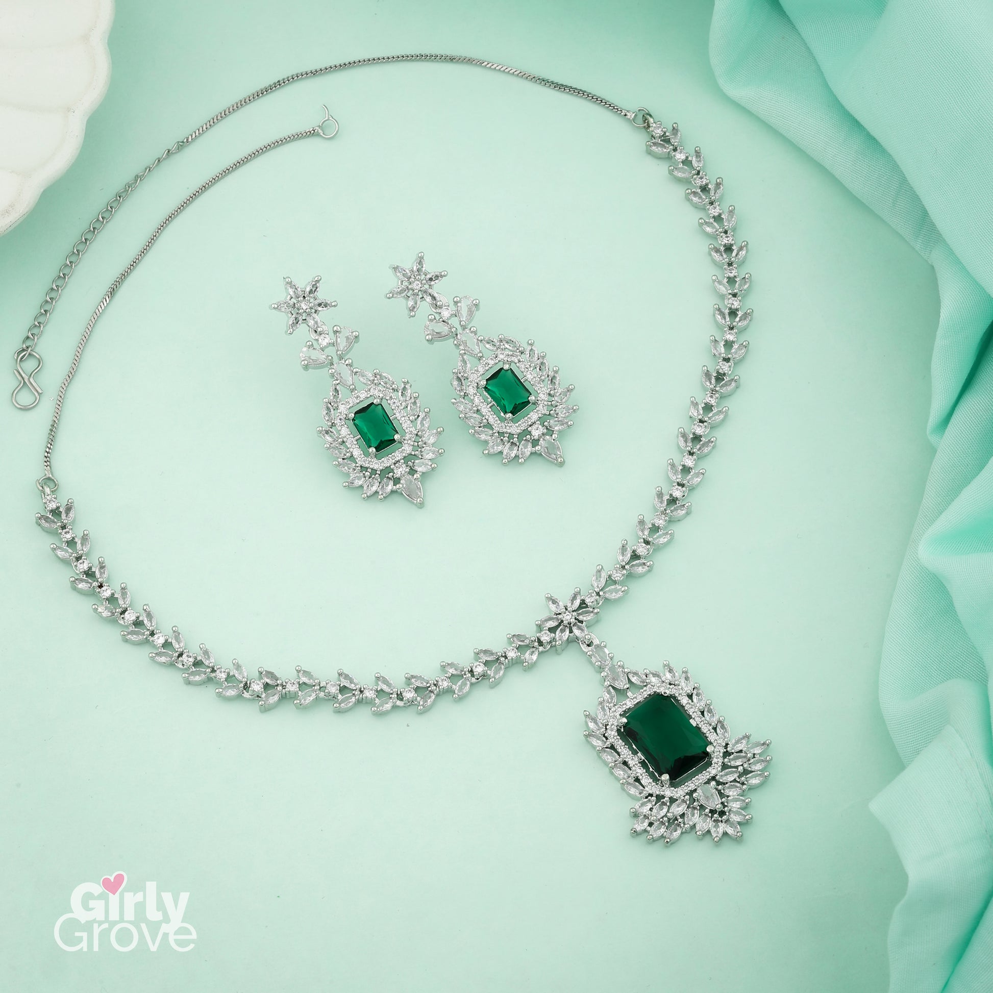 Bring elegance to every occasion with the Emerald Elegance Diamond Necklace Set. Featuring a stunning emerald centerpiece surrounded by a sparkling halo of diamonds, this set is designed to make you shine with timeless beauty.