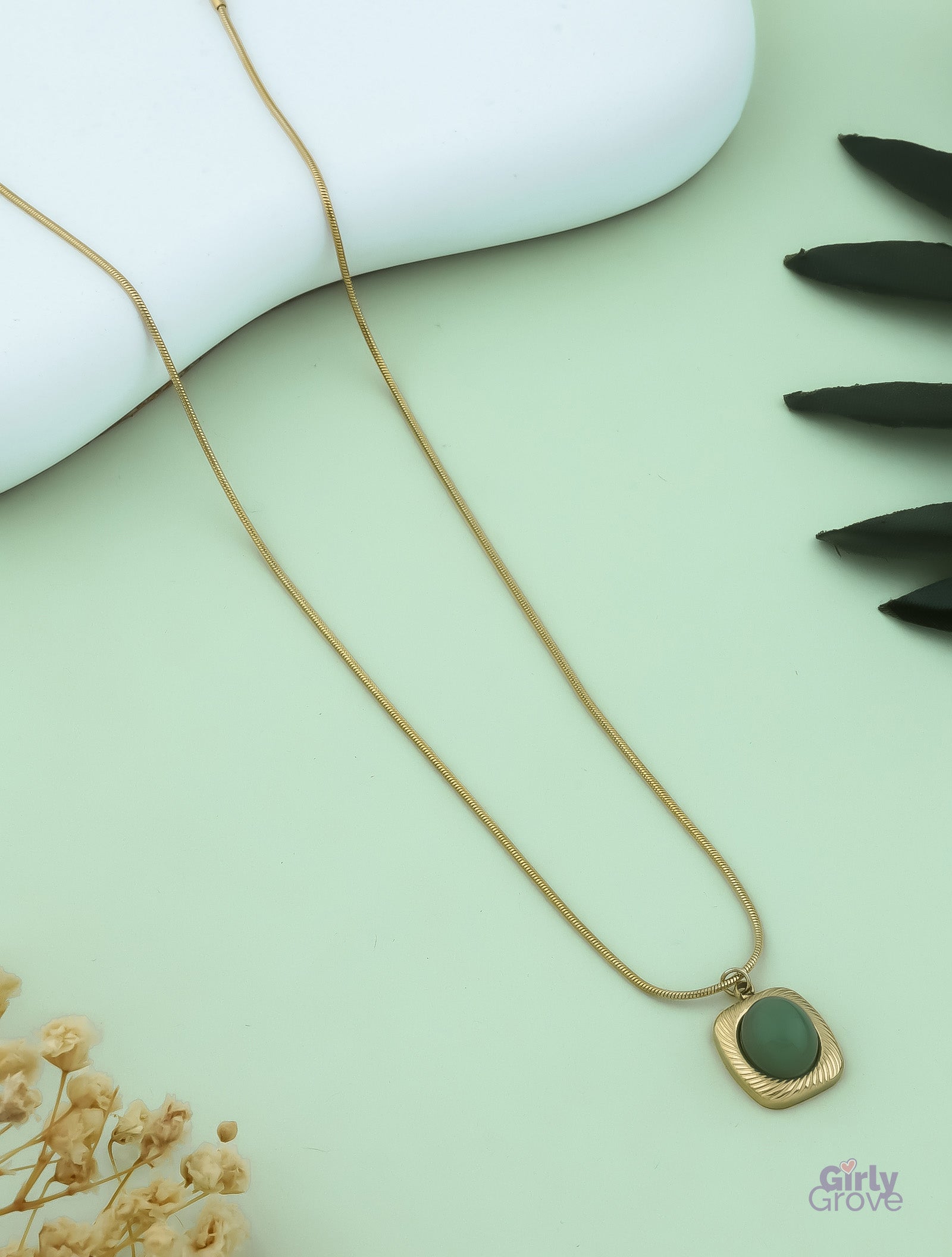 A blend of nature’s charm and modern luxury! This gold-plated necklace features a deep green stone pendant in a sleek, textured frame, adding a touch of sophistication to your everyday style.
