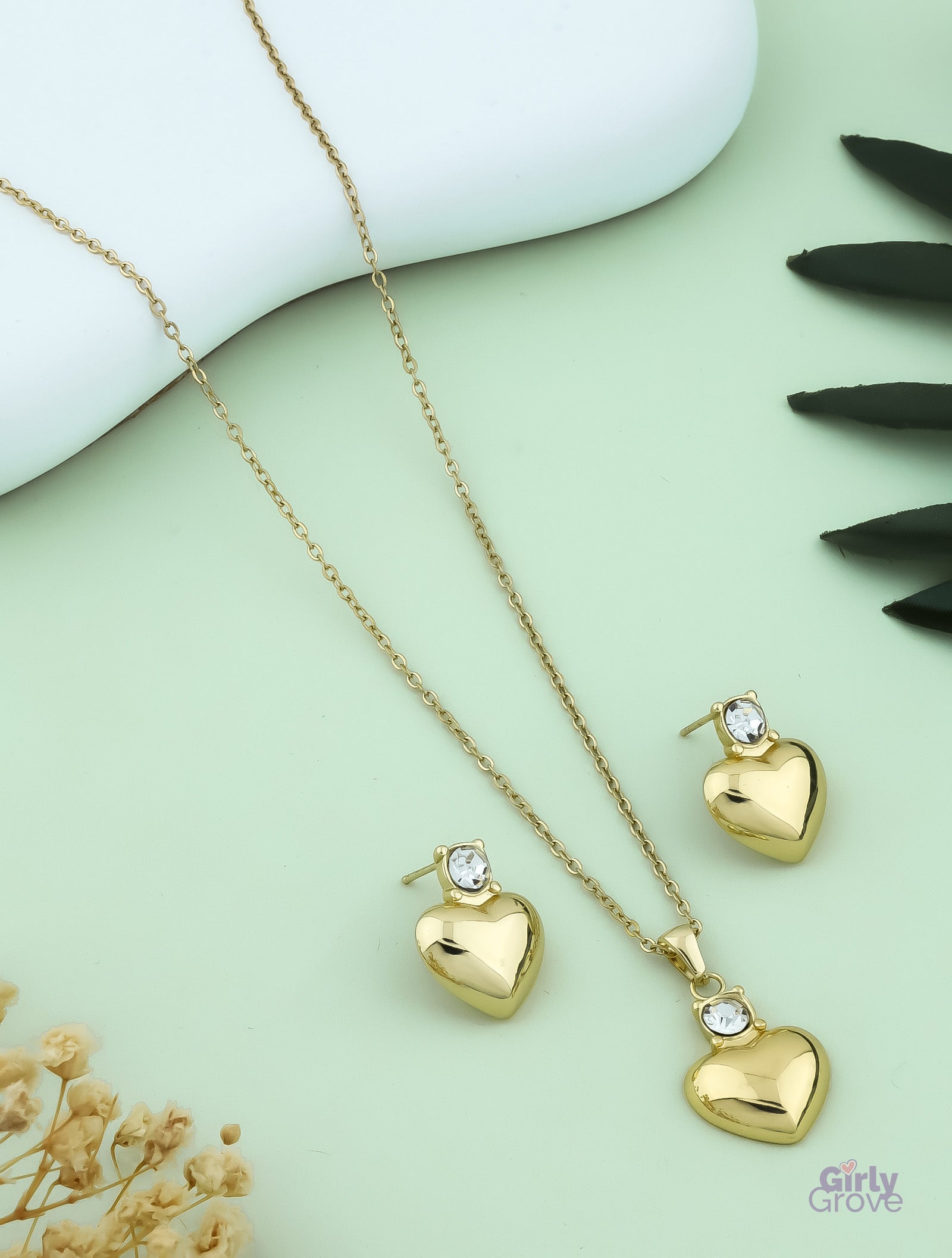 Pure elegance, timeless love! This premium gold-plated pendant & earring set features shimmering crystal accents with sleek heart charms, making it a perfect statement of sophistication and romance.
