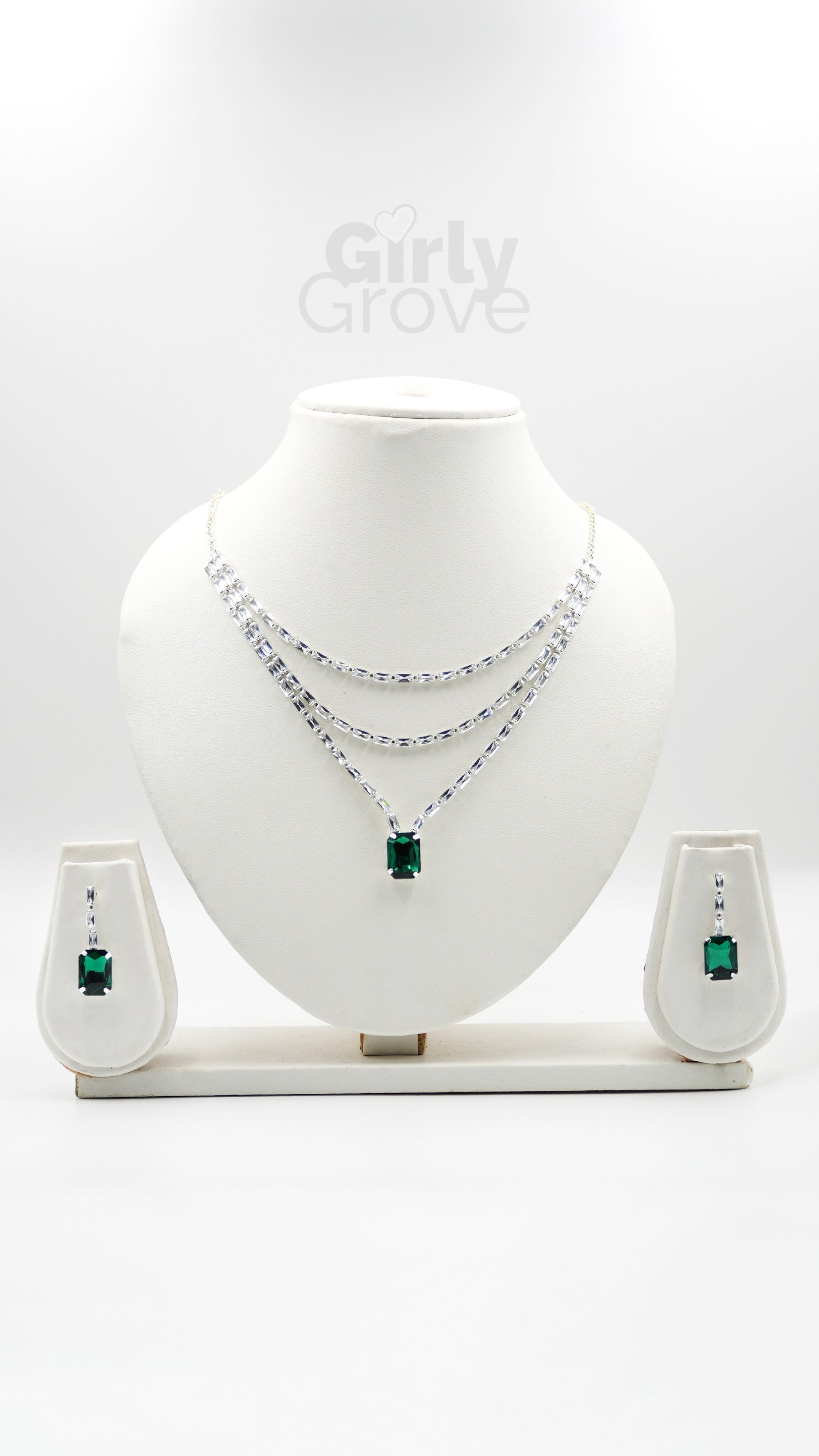 A sophisticated blend of simplicity and elegance, this necklace set features a sleek design with radiant emerald-colored stones. Paired with matching earrings, it is ideal for understated luxury, enhancing both casual and formal outfits effortlessly.