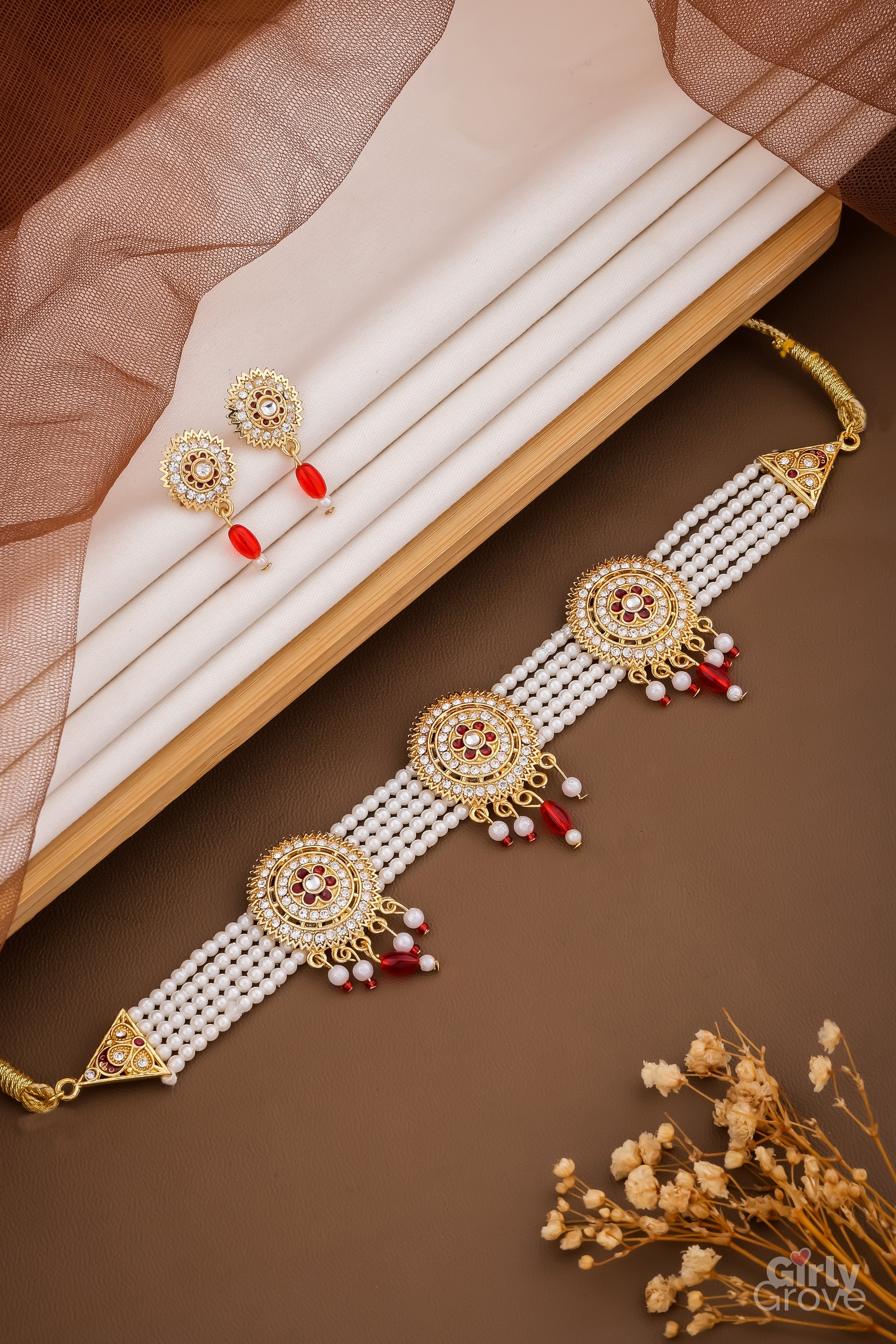 Make a bold statement with the Royal Red Kundan Pearl Choker Set. Featuring multi-strand pearls, intricate gold-plated kundan work, and rich red bead accents, this choker set is a perfect blend of tradition and luxury. The matching earrings add the finishing touch, making it ideal for weddings and festive celebrations.