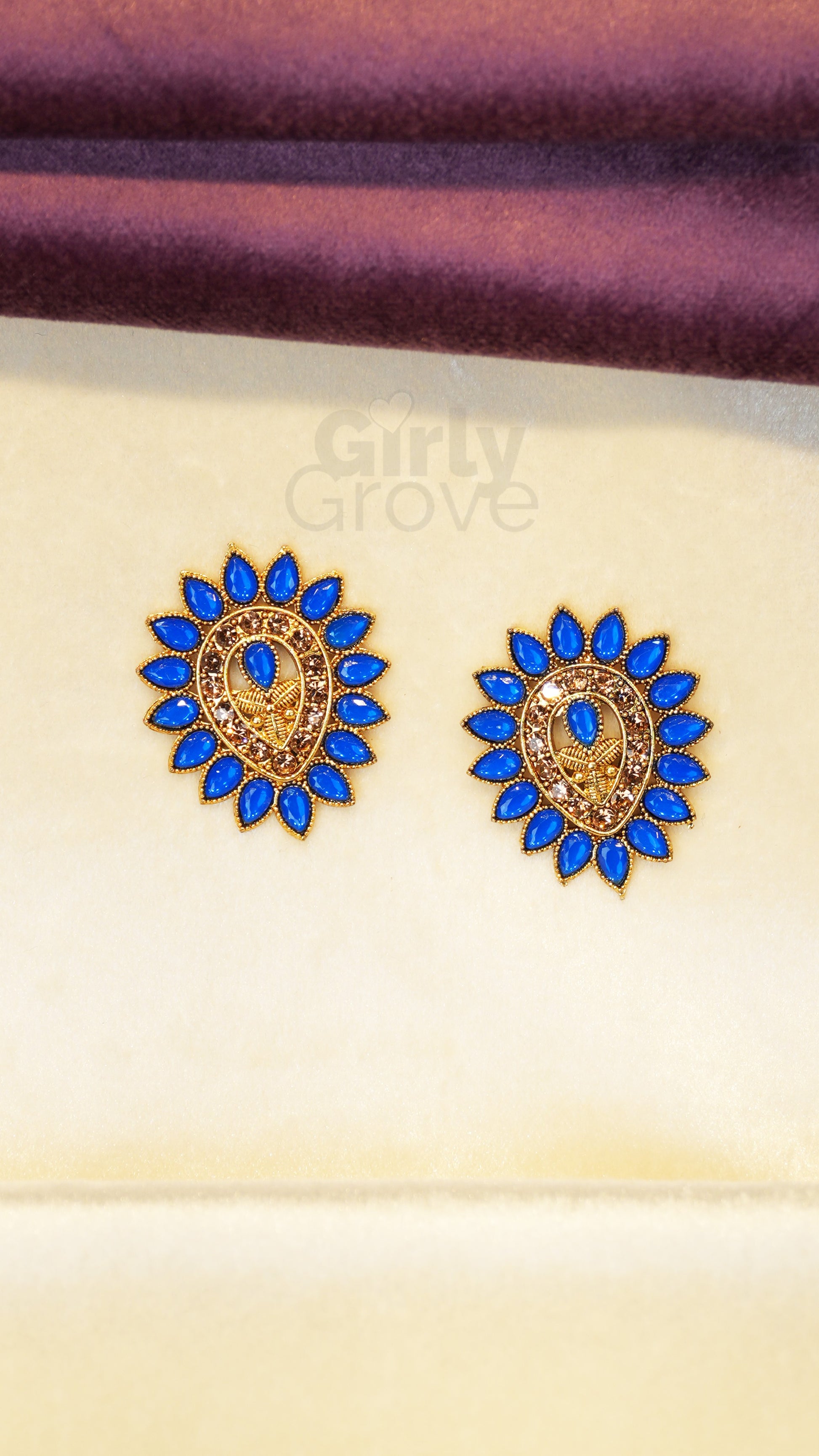 Embrace elegance with these intricately designed stud earrings. Featuring vibrant stones encased in a floral motif, these studs are perfect for both casual and festive occasions. The bold colors and intricate craftsmanship make these earrings a statement piece, ideal for those who love to blend tradition with modern fashion.